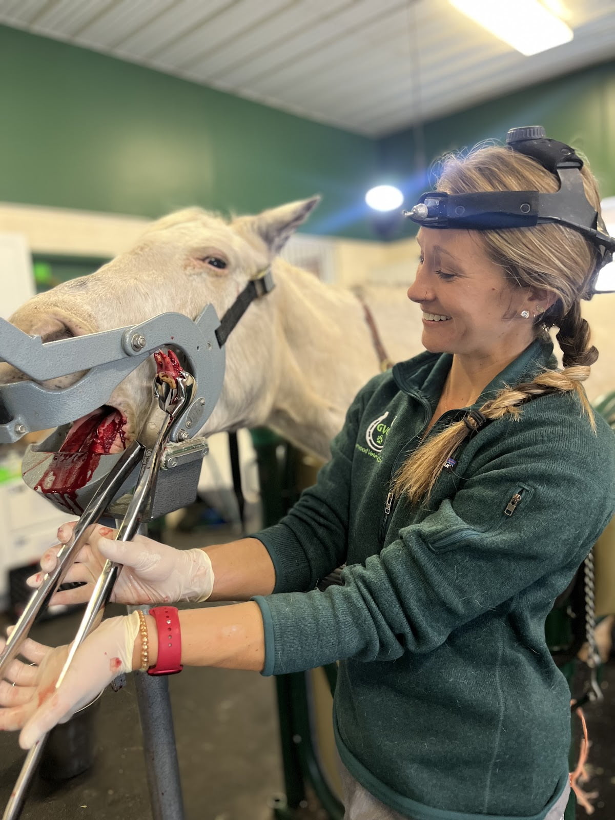 Every dental exam starts with a physical exam, to assess the horse’s overall health and ensure sedation will be safe to give. We also take this time to look over the structure of the horse’s head: muscles involved with moving the mouth, chewing, etc., the TMJ joint (where the jaw meets the skull), and cranial nerve function. Once the horse is sedated, we rinse the mouth and begin the oral exam. This may look very similar to a human dentist: mirror, probe, light, and all! We see how the teeth are lined up, and how they are wearing. A horse’s upper jaw is wider than their lower jaw, which is why we see ‘points’ start to form on the cheek side of the upper teeth and tongue side of the lower teeth. Occasionally, these points can get very sharp and lead to ulcers in the cheeks, which understandably is uncomfortable for a horse. An owner may notice a horse being unwilling to take a bit, reluctant to work toward one side or the other, or become reluctant for oral medications among other things. We check for food packing between the teeth, which can be an early sign of periodontal disease.